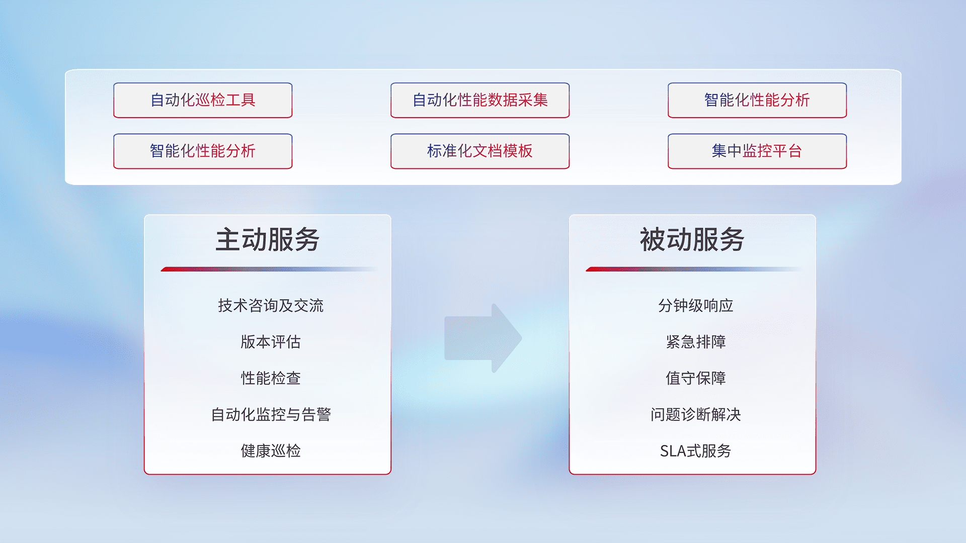 智能化工具和标准化文档,,,,保障服务质量,,,提供主动服务(包含技术咨询、、版本评估、、、性能检查、、、自动化监控与告警、、、健康巡检)和被动服务包含(分钟级响应、、、、紧急排障、、、值守保障、、、、问题诊断解决、、、、SLA服务)。。。。